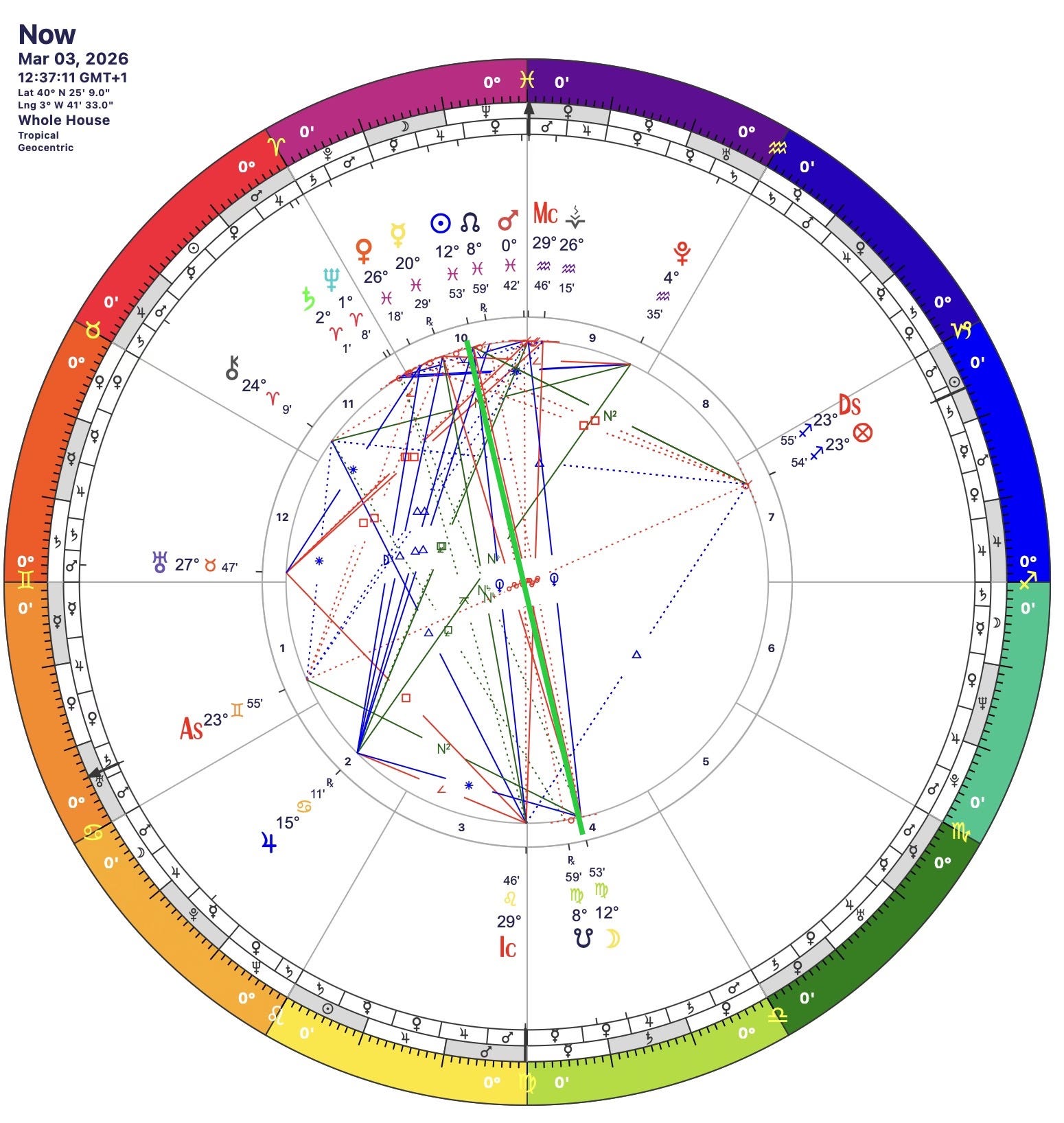 In tropical astrology, this lunar eclipse falls across the Virgo–Pisces axis: the Moon in Virgo opposing the Sun in Pisces, with the lunation drawn close to the lunar nodes, those invisible crossings where the Moon’s orbit intersects the ecliptic, forming magnetic, supercharged points in time. Note: on March 18, the next New Moon in Pisces, joined by Mars, will show more clearly how this eclipse is unfolding; until then, much of it is sensed before it can be named. This eclipse is shaped by Virgo discernment, Pisces surrender, and Jupiter in Cancer offering support—a sextile to the Moon, a trine to the Sun, and a softening influence within an otherwise fated sky. The ruler of Virgo, Mercury, is retrograde in Pisces, adding awareness through memory, revision, feeling, unfinished conversations, and the return of old material asking to be re-understood.